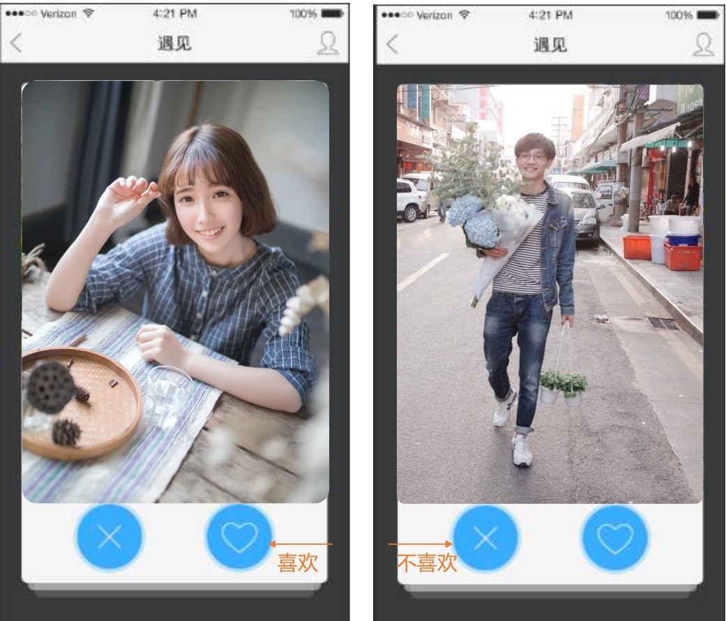 1. 左滑或者点击叉号代表不喜欢,点击心形代表喜欢