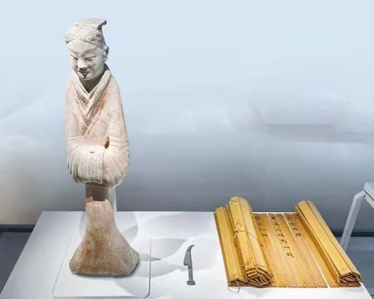 展厅中有一尊戴冠文吏俑,其身着深衣,下巴微微收起,双手合于腹前,身姿恭谨。在其身旁还展出了一枚书刀和一方简牍,书刀用于修改竹简、木牍上所写文字,遇到有错漏时以刀削之,重新书写。一尊文吏俑、一枚书刀,再现了汉代官员严谨恭谦的形象。东汉张衡有诗:“美人赠我金错刀,何以报之英琼瑶?”