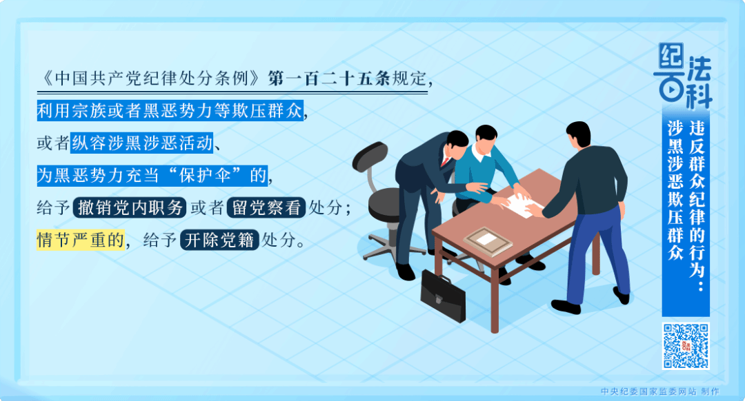 《中国共产党纪律处分条例》第一百二十五条规定,利用宗族或者黑恶势力等欺压群众,或者纵容涉黑涉恶活动、为黑恶势力充当“保护伞”的,给予撤销党内职务或者留党察看处分;情节严重的,给予开除党籍处分。